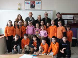 Ayşe Meva Ayvaz, Aybüke Yılmaz ve Asel Eva Zortul; Okul Müdürü Kenan Kahraman, Rehber Öğretmen Dilek Kar ve Görme Engelliler Sınıfı Öğretmeni Emine Aksu eşliğinde Kaynaşlı İlkokulu 4/C sınıfında derse konuk oldu.