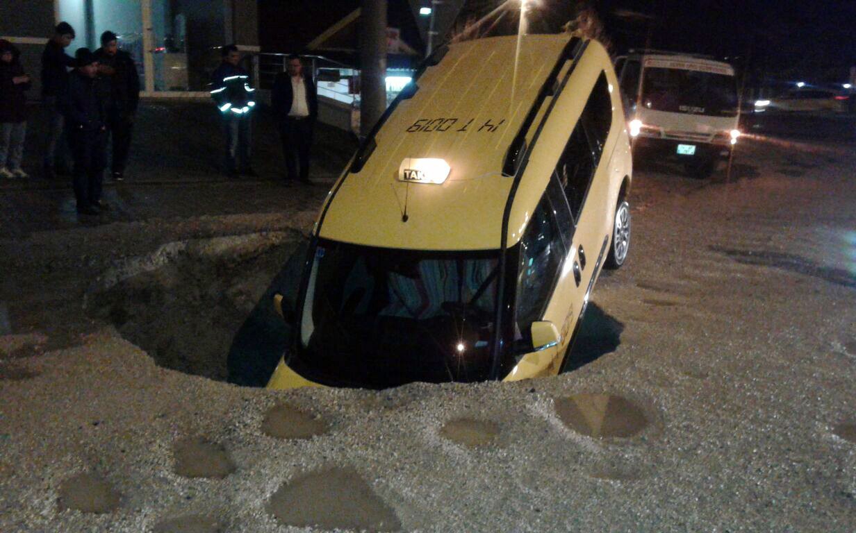 Bolu'da gece yarısı şiddetli yağmur nedeniyle yolda oluşan göçüğü farkedemeyen bir taksi çukurun içine düştü.