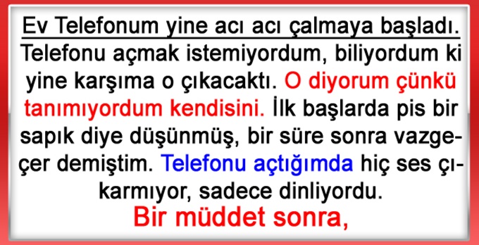 Ev Telefonum yine acı acı çalmaya başladı. Telefonu açmak istemiyordum, biliyordum ki yine karşıma o çıkacaktı. O diyorum çünkü tanımıyordum kendisini. İlk başlarda pis bir sapık diye düşünmüş, bir süre sonra vazgeçer demiştim.