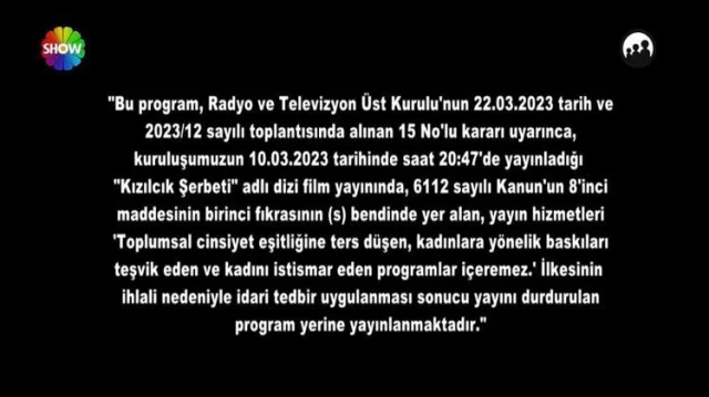 15 Nisan 2023 Cumartesi 21:50Sıla Türkoğlu:"Her gün yüzlercesine maruz kalınan, defaatle sessizleştirilen bir hal yaşanırken; üstelik safi anlatılan, her karakterinde birilerinin hikayesini bulduğu, aksine dayatılan her düşünceyi bir aradan yaşamaya, yaşarken var olmaya, anlatmaya çalışan ekibimiz ve bizimle bu yola gönül vermiş, zaman ayırmış olan izleyicilerimizin bu yaptırıma maruz bırakılmasını kabul etmiyoruz. Emek verilen her şey değerlidir. Sanat ve sanatçı c-ezalandırılamaz. Bu değersizleştirilmeyi hak etmiyoruz."