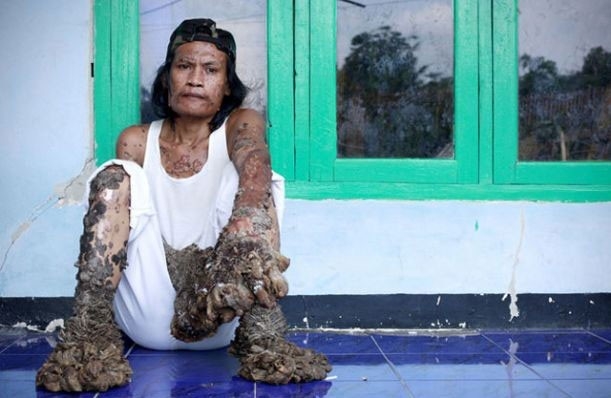 29 Temmuz 2015 Çarşamba 06:12Ağaç adam sendromu: Genetik olan bu hastalıkta boyun, el ve ayaklarda anormal büyüklükte oluşumlar belirir.