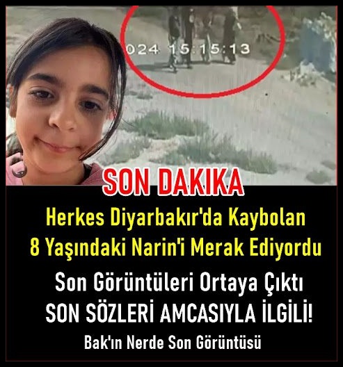 25 Ağustos 2024 Pazar 00:10Diyarbakır'ın Bağlar ilçesi kırsal Tavşantepe Mahallesi'nde 2 gün önce kaybolan 8 yaşındaki Narin Güran'ı arama çalışmaları sürerken, küçük çocuğun halası ise bulunan terliğin Narin'e ait olmadığını söyledi. ve son sözleri amcasıyla ilgili. Haberimizin devamını okumak için Lütfen sonraki sayfaya geçiniz..