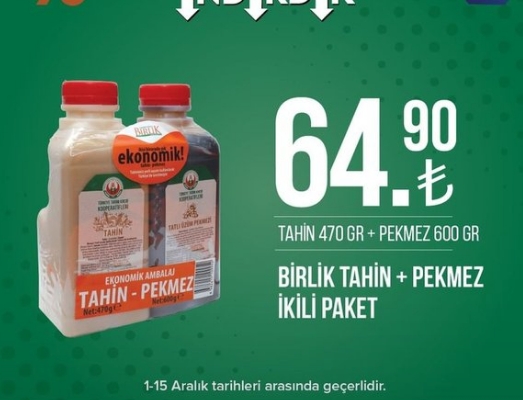 03 Aralık 2022 Cumartesi 21:49Tahin pekmez 64.90 tl.den satışa sunulacak.Tarım Kredi Kooperatif Marketler tarafından yayımlanan indirimli ürünler listesinde şu ürünler yer alıyor: