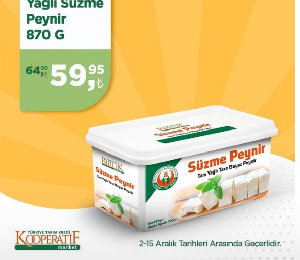 03 Aralık 2022 Cumartesi 21:49Tarım Kredi Kooperatif Marketler tarafından yayımlanan indirimli ürünler listesinde şu ürünler yer alıyor:Süzme peynir ise 59.95 tl. den satışa sunulacak.
