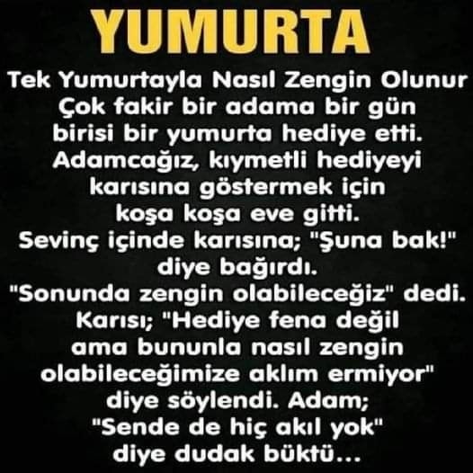 “Sende de hiç akıl yok” diye dudak büktü… “Bak, hem de nasıl zengin olacağız! Bu gece, yumurtayı komşunun tavuğunun yumurtalarının arasına koyacağım. Civcivler çıktığı vakit dişi olanlarından birini seçip alacağım.Hikayeyi okumak için diğer sayfamıza geçiniz.HABERİN DEVAMINI OKUMAK İÇİN GÖRSELE DO/KUNUNUZ..T’IKLAYINIZ..