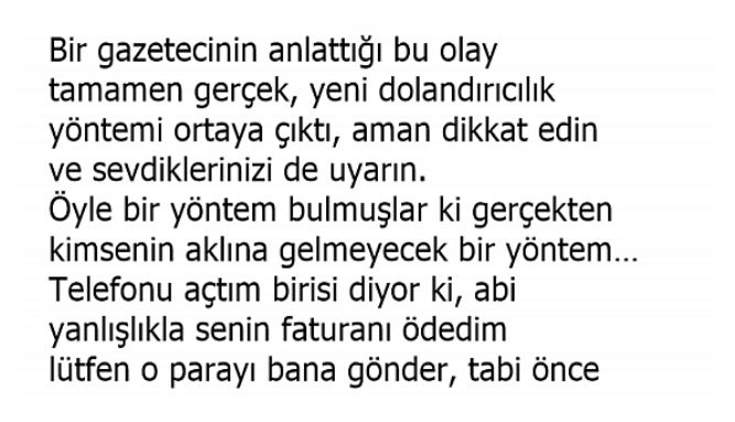abi yanlışlıkla senin faturanı ödedim lütfen o parayı bana gönder, tabi önce inanamadım sonra telefon şirketini aradım baktım gerçekten fatura ödenmiş sonra. Sonra telefondaki arkadaşa ödediği miktarı göndermeye karar verdim ama aklıma da bir kurt düştü.Ya bu adam faturayı sonradan iptal ederse ne olacaktı? Şirketi aradım ve bu faturayı kim ödemiş sordum, ne yazık ki şirket kimin ödediğini bilmiyoruz dediler. Nasıl yani faturamı ödeyen kişinin kim olduğunu bilmiyor musunuz dedim evet bilmiyoruz dediler. Yani telefondaki kişiyi telefon şirketinden teyit edemedim. Sonra telefondaki adamı biraz sorgulamaya başladım, benim faturam yüklü sen niye böyle bir faturayı ödedin ki, kaza oldu, hata oldu bir sayı hatası yüzünden oldu demeye başladı. Tamam pazartesi yollayacağım dedim.