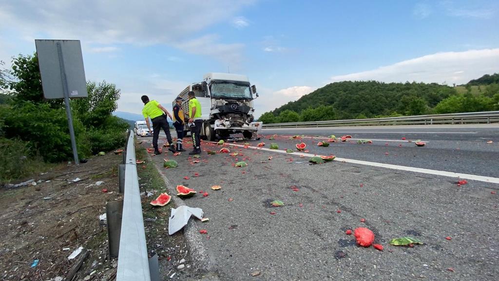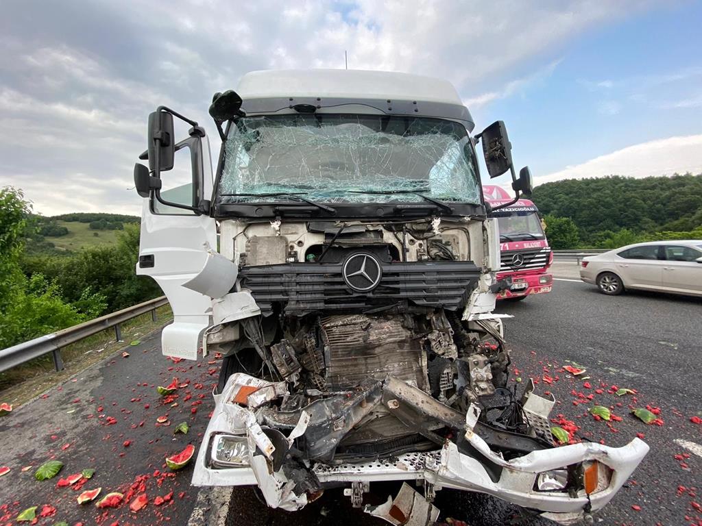 Olay akşam Saatlerinde TEM Otoyolu Gümüşova rampaları İstanbul istikametinde meydana geldi. Edinilen bilgilere göre Düzce’den İstanbul istikametine seyir halinde olan Mehmet Yeşildağ idaresindeki 81 AAE 074 plakalı hurda yüklü kamyon, önünde seyir halinde olan Adnan Gökesen idaresindeki 51 EA 636 plakalı karpuz yüklü kamyona çarptı.