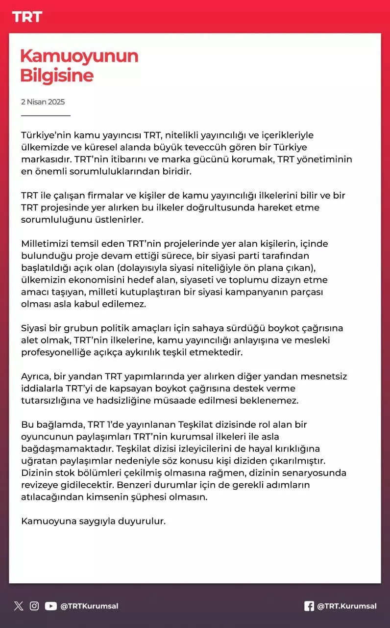 07 Nisan 2025 Pazartesi 21:02“PARÇASI OLMASI ASLA KABUL EDİLEMEZ” “Türkiye’nin kamu yayıncısı TRT, nitelikli yayıncılığı ve içerikleriyle ülkemizde ve küresel alanda büyük teveccüh gören bir Türkiye markasıdır. TRT’nin itibarını ve marka gücünü korumak, TRT yönetiminin en önemli sorumluluklarından biridir. TRT ile çalışan firmalar ve kişiler de kamu yayıncılığı ilkelerini bilir ve bir TRT projesinde yer alırken bu ilkeler doğrultusunda hareket etme sorumluluğunu üstlenirler. Milletimizi temsil eden TRT’nin projelerinde yer alan kişilerin, içinde bulunduğu proje devam ettiği sürece, bir siyasi parti tarafından başlatıldığı açık olan (dolayısıyla siyasi niteliğiyle ön plana çıkan), ülkemizin ekonomisini hedef alan, siyaseti ve toplumu dizayn etme amacı taşıyan, milleti kutuplaştıran bir siyasi kampanyanın parçası olması asla kabul edilemez. “HADSİZLİĞE MÜSAADE EDİLMESİ BEKLENEMEZ” Siyasi bir grubun politik amaçları için sahaya sürdüğü boykot çağrısına alet olmak, TRT’nin ilkelerine, kamu yayıncılığı anlayışına ve mesleki profesyonelliğe açıkça aykırılık teşkil etmektedir. Ayrıca, bir yandan TRT yapımlarında yer alırken diğer yandan mesnetsiz iddialarla TRT’yi de kapsayan boykot çağrısına destek verme tutarsızlığına ve hadsizliğine müsaade edilmesi beklenemez. Bu bağlamda, TRT 1’de yayınlanan Teşkilat dizisinde rol alan bir oyuncunun paylaşımları TRT’nin kurumsal ilkeleri ile asla bağdaşmamaktadır. Teşkilat dizisi izleyicilerini de hayal kırıklığına uğratan paylaşımlar nedeniyle söz konusu kişi diziden çıkarılmıştır. Dizinin stok bölümleri çekilmiş olmasına rağmen, dizinin senaryosunda revizeye gidilecektir. Benzeri durumlar için de gerekli adımların atılacağından kimsenin şüphesi olmasın. Kamuoyuna saygıyla duyurulur.” kaynak: haber7