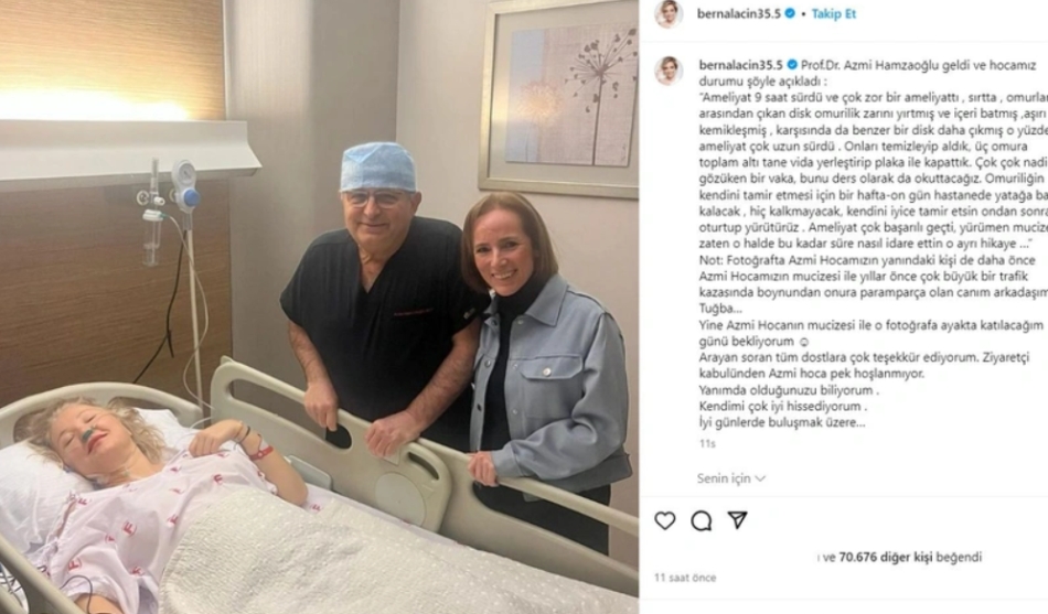 07 Temmuz 2024 Pazar 22:26Omuriliğinin kendini tamir etmesi için bir hafta-on gün hastanede yatağa bağlı kalacağını duyuran Laçin, doktorunun “Yürümen mucize, o halde bu kadar süre nasıl idare ettin o ayrı hikâye” dediğini aktardı. Berna Laçin’in paylaşımı şöyle:”Ameliyat sonrası Prof.Dr. Azmi Hamzaoğlu geldi ve hocamız durumu şöyle açıkladı:‘ Ameliyat 9 saat sürdü ve çok zor bir ameliyattı, sırtta, omurlar arasından çıkan disk omurilik zarını yırtmış ve içeri batmış, aşırı kemikleşmiş, karşısında da benzer bir disk daha çıkmış o yüzden ameliyat çok uzun sürdü…”Onları temizleyip aldık, üç omura toplam altı tane vida yerleştirip plaka ile kapattık. Çok çok nadir gözüken bir vaka, bunu ders olarak da okutacağız…’Omuriliğin kendini tamir etmesi için bir hafta-on gün hastanede yatağa bağlı kalacak, hiç kalkmayacak, kendini iyice tamir etsin ondan sonra oturtup yürütürüz…’