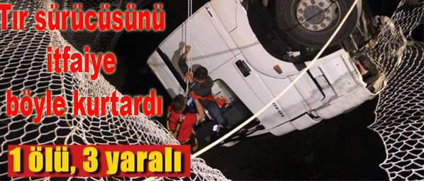 TEM Otoyolu üzerinde kontrolden çıkarak devrildikten sonra viyadükten sarkan tırın sürücüsü, itfaiye ekipleri tarafından halat yardımıyla kurtarıldı. Yolu kapatan tıra çarpan araçtaki 1 kişi yaşamını yitirdi, 3 kişi yaralandı