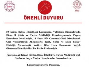 Tüm yurtta olduğu gibi Düzce’de 50. Turizm Haftası çeşitli etkinliklerle kutlanıyor. Düzce valiliği himayelerinde 18 Nisan 2026 Cumartesi günü düzenlenecek olan Konuralp’ten Akçakoca’ya tarih, kültür ve doğa rotası etkinliği, meteorolojik verilere göre hava durumunun yağışlı göstermesi sebebiyle ileri bir tarihe ertelendi.