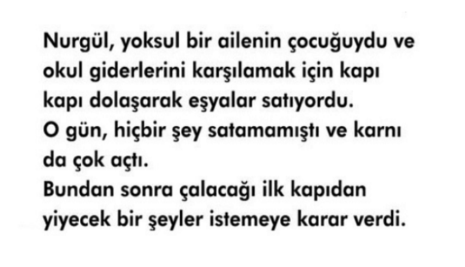 Nurgül, yoksul bir ailenin çocuğuydu ve okul giderlerini karşılamak için kapı kapı dolaşarak eşyalar satıyordu. O gün, hiçbir şey satamamıştı ve karnı da çok açtı. Bundan sonra çalacağı ilk kapıdan yiyecek bir şeyler istemeye karar verdi.