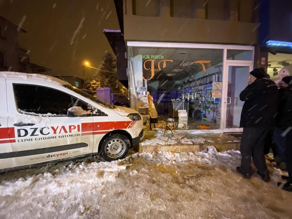 Düzce Eski Bolu Caddesi’nde etkili olan kar yağışı sonrasında buz pistine dönen yolda direksiyon hakimiyetini kaybeden kamyonet, karda kaymaya başladı. Kamyonet yön levhalarına ardından kolonya dükkanına çarparak durabildi.