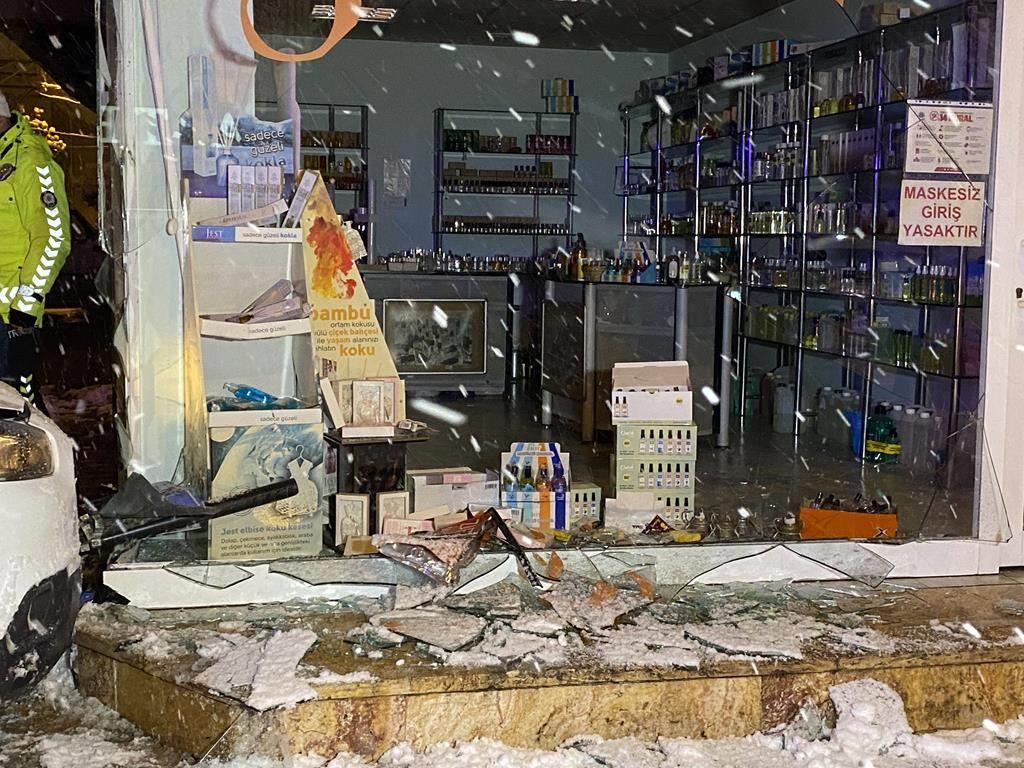 Şans eseri kazada yaralanan olmazken dükkanda ve araçta maddi hasar meydana geldi.