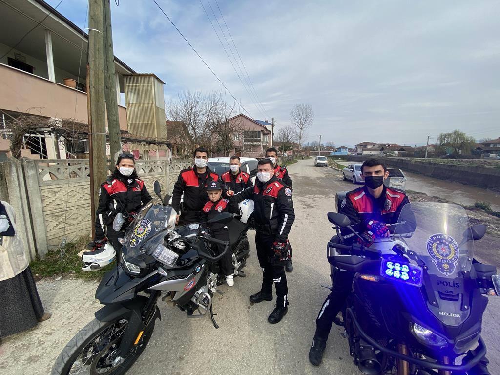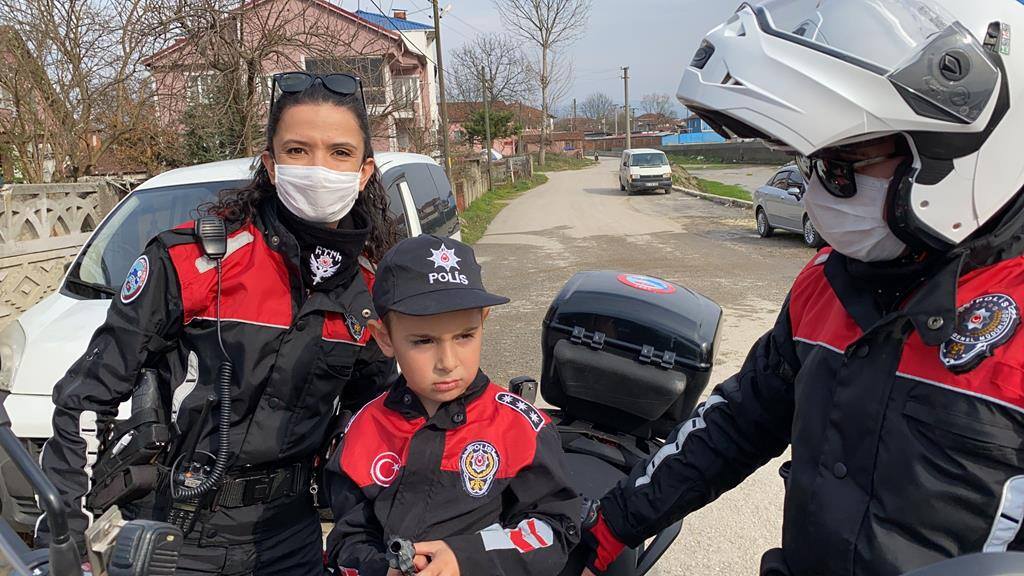 Emniyet Genel Müdürlüğü tarafından ‘Minik Baş komiser devriyede’ diyerek paylaşılan video sonrasında Düzce İl Emniyet Müdürlüğü Asayiş Şube Müdürlüğü’ne bağlı Motorize yunus timleri minik başkomiseri ziyaret etti.