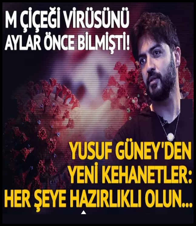19 Ağustos 2024 Pazartesi 23:30M çiçeği virüsünü aylar önce bilmişti! Yusuf Güney'den yeni kehanetler: Her şeye hazırlıklı olun... Dünya Sağlık Örgütü (DSÖ), Afrika'da maymun çiçeği virüsü nedeniyle son iki yılda ikinci kez küresel halk sağlığı acil durumu ilan etti. Acil durum ilanından sonra Yusuf Güney'in daha önce katıldığı bir programdaki "Ağustos ayında çok ciddi bir pandemi geliyor" sözleri sosyal medyada gündem olmuştu. Güney, bu kez yeni uyarılarda bulundu. Haberimizin devamını okumak için Lütfen sonraki sayfaya geçiniz..