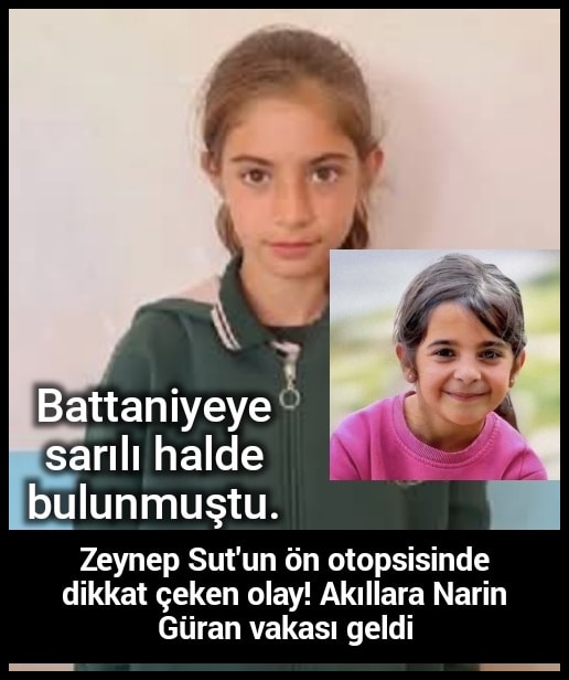 20 Ağustos 2025 Çarşamba 22:21Mardin'de geçtiğimiz günlerde ailesinin jandarmayı arayarak 12 yaşındaki kızları Zeynep Sut'un kayalıklardan düşerek hayatını kaybettiği ihbarı sonrası bölgeye ekipler sevk edildi. Zeynep Sut'un cansız bedeni otomobilde battaniyeye sarılı halde bulunurken, otopsi için Adli Tıp'a gönderildi. Talihsiz kızın yapılan ön otopsisinde iç kanama tespit edilirken, battaniyede de çok sayıda parmak izi bulunduğu bildirildi. Şüphe uyandıran gelişmeler sonrası akıllara Narin Güran olayı geldi. Haberin devamını okumak için Lütfen sonraki sayfaya geçiniz.