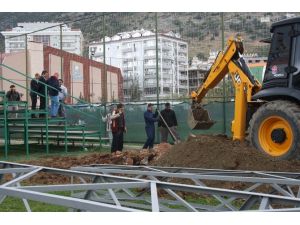 18 metrelik dört adet aydınlanma direği sahada ışığın en verimli kullanılacağı şekilde gerekli ölçümler yapılarak yerleştirilirken, Alanya Belediyesi Spor Müdürü Levent Uğur ve Albimo Alanyaspor Taraftar Sorumlusu Yönetim Kurulu Üyesi Turan Görgün yapılan çalışmaları yerinde inceledi.